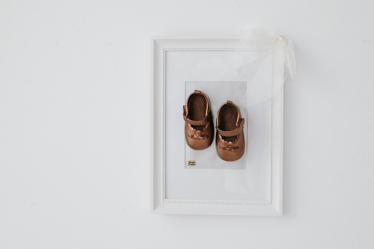 Čeveljčke lahko dobite v osnovni obliki, da jih boste lahko ob priložnostih skupaj s svojimi najbližjimi vzeli v roke in z njimi obujali spomine. Lahko pa jih namestimo tudi v okvir, ki ga obesite na vidno mesto in dodate nekaj čarobnosti v svoj dom.